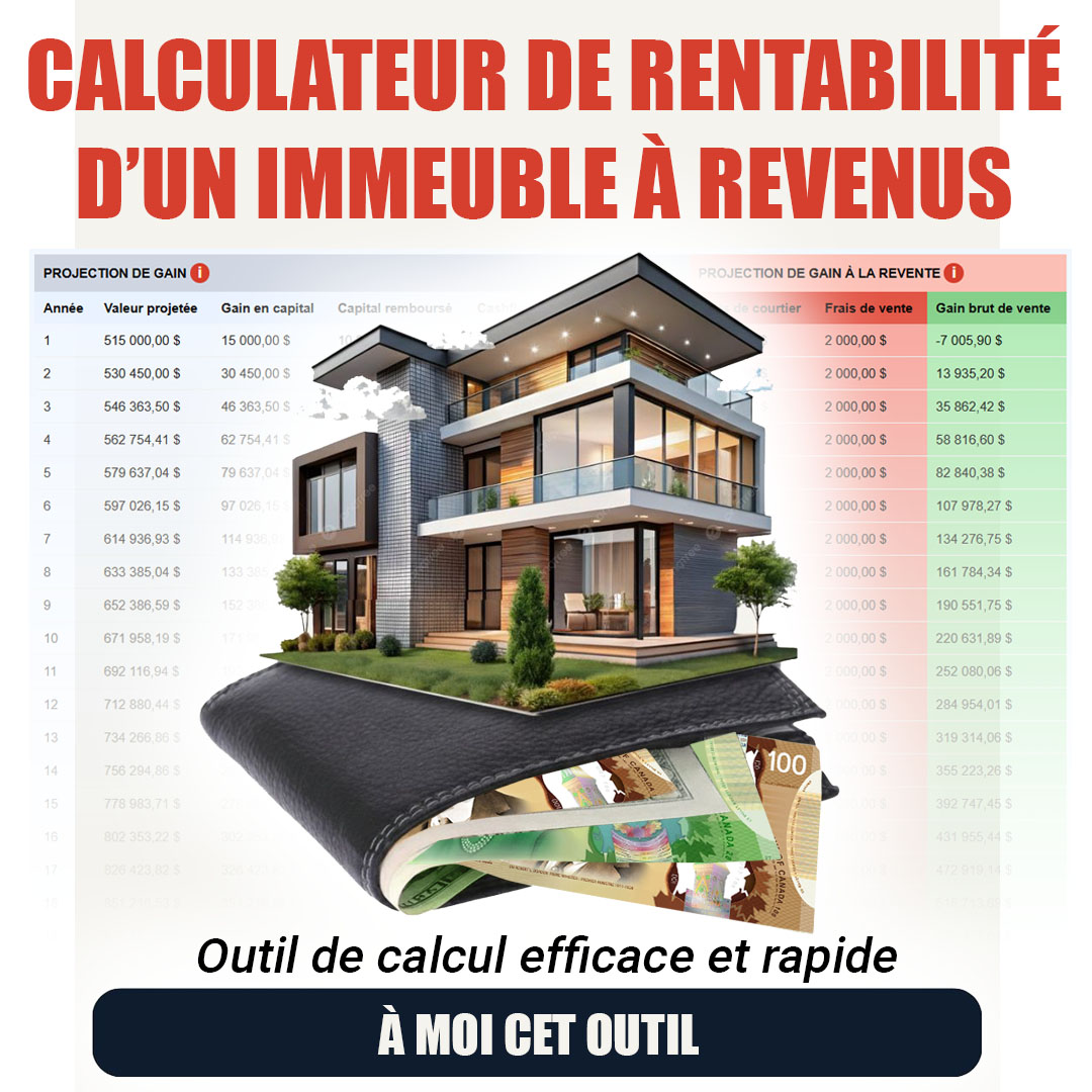 Bien qu’il soit simple, ce ratio n’est pas le plus précis parce qu’il ne tient pas compte de toutes les dépenses reliées à l’immeuble ainsi que toutes les améliorations locatives et augmentations des revenus dans le temps. Pour vous aider à mieux évaluer un immeuble, vous pouvez utiliser le calculateur de rentabilité d’un immeuble à revenus en vente sur le site. Il pourrait vous éviter de mauvaises surprises.